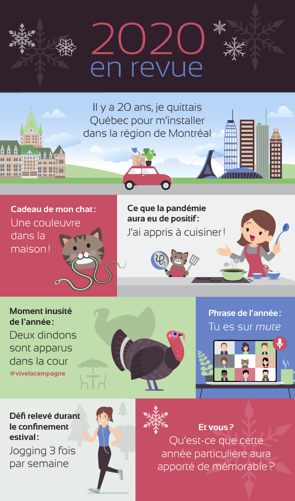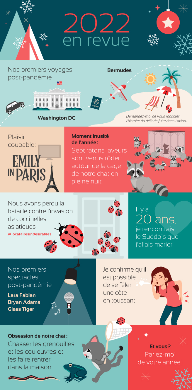 Chaque année j’envoie à mes clients, ma famille et mes amis ma « revue de l’année ». C’est une façon amusante pour moi de connecter avec mes proches durant le temps des Fêtes et de créer des liens avec mes clients qui me connaissent moins personnellement.